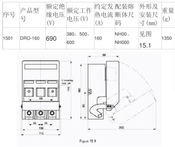 產品型號、額定絕緣電壓、額定工作電壓、約定發熱電流、外形及安裝尺寸、工作條件及通斷能力分別見圖15.1及表15.1~15.3